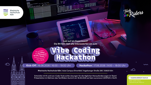 Der Vibe Coding Hackathon startet mit einem gemeinsamen Kick-off am 16.06. an der Rheinischen Hochschule Köln.